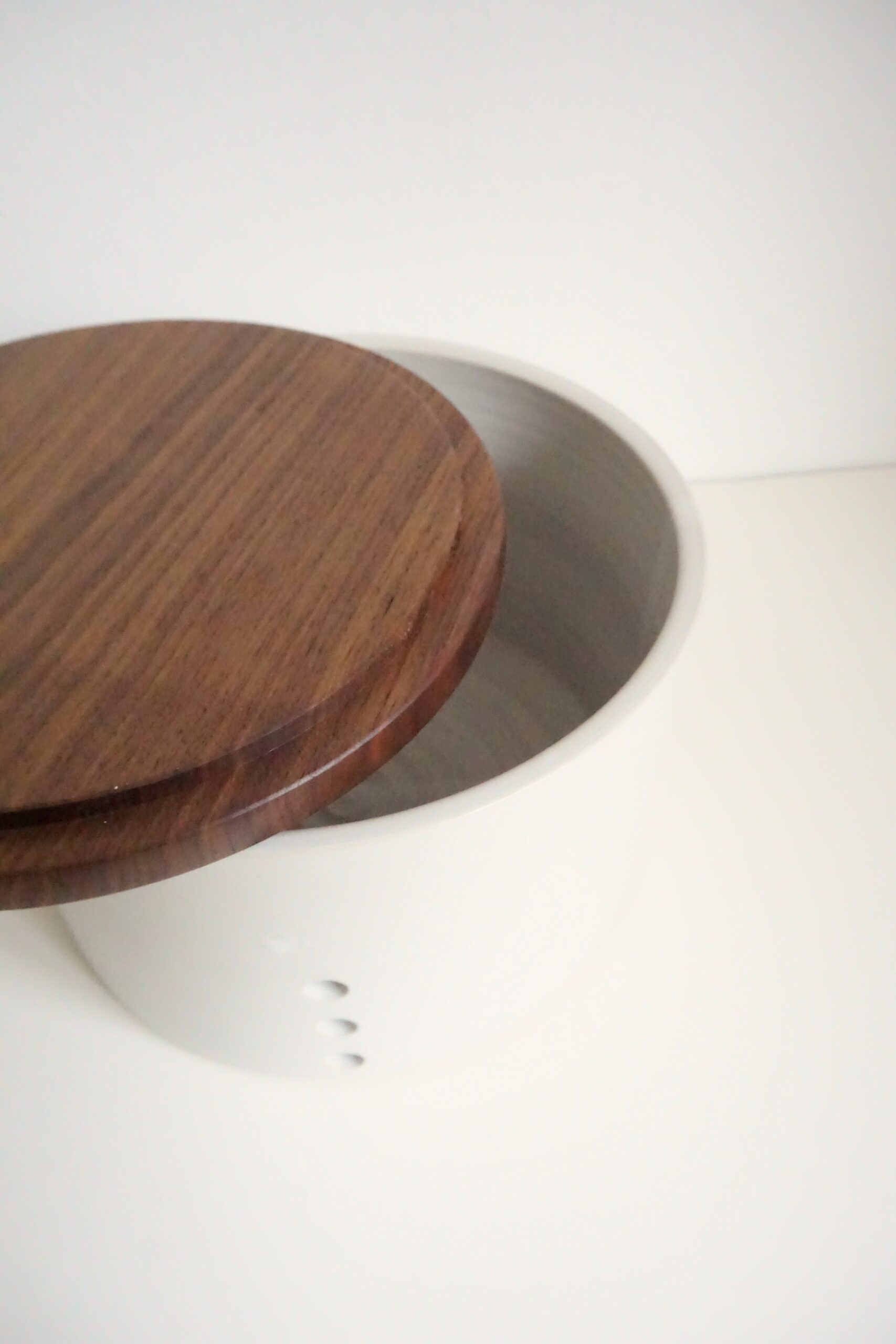 Der Deckel aus Walnuss wurde von Peter individuell für diesen Brottopf angefertigt. Er ist innen und außen mit Hartöl behandelt, sodass er diffusionsoffen bleibt und die Frische des Brots bewahrt.